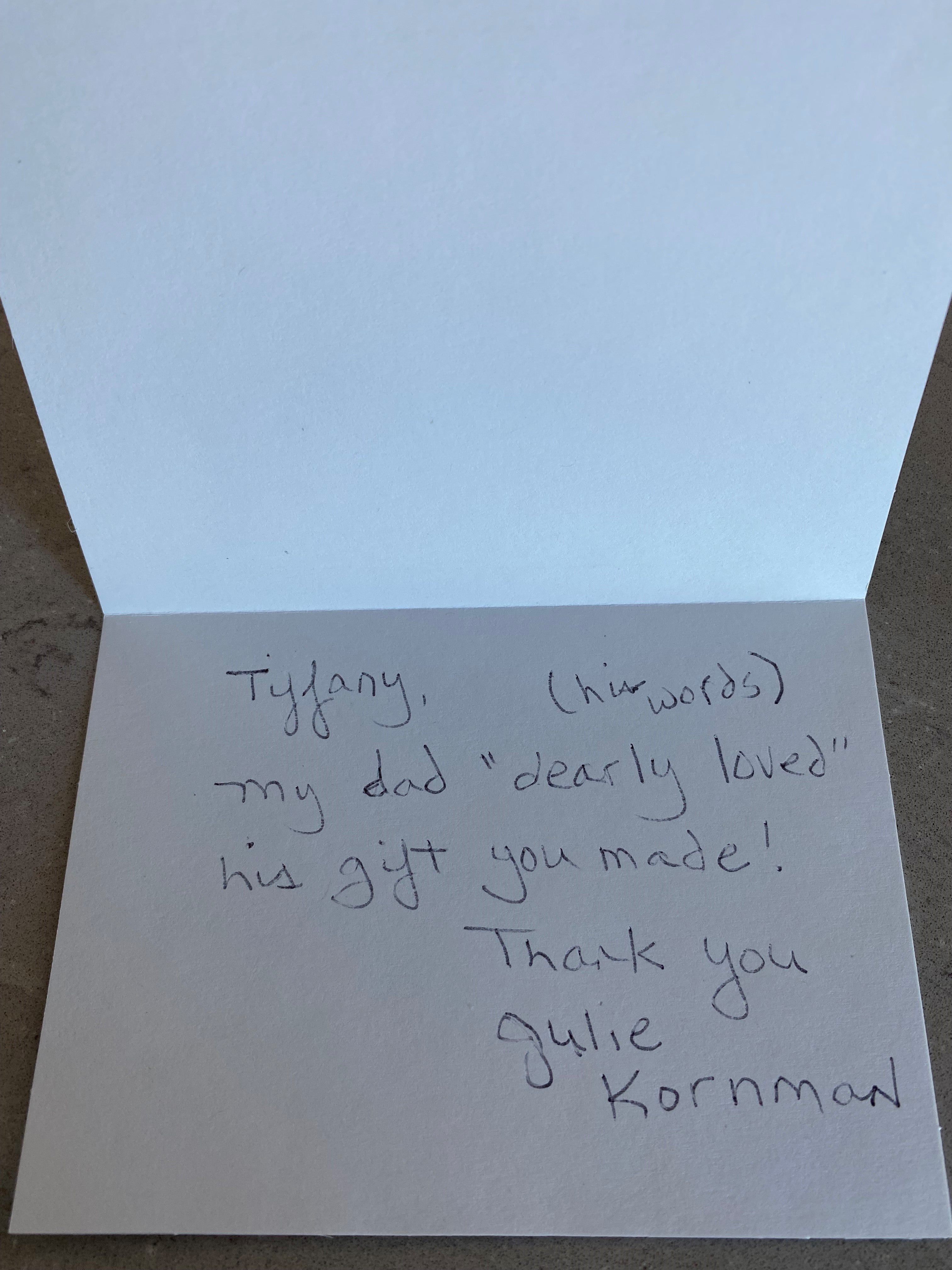 "Tiffany, my dad dearly loved (his words) his gift you made."-Julie K.